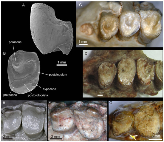 Figure 2. Morphology of ultimate upper premolars in anagalids and large mimotonids. (A,B), left P4 (IVPP V26960), new specimen from the middle Eocene, Huheboerhe, Erlian Basin, Nei Mongol, China. (C), Gomphos elkema, left maxilla fragment with P3–M1 (IVPP NNG047) from the early Eocene, Nuhetingboerhe, Nei Mongol, China. (D), Mimolagus rodens, right P3–M1 (holotype specimen IVPP RV51002.1, mirror view) from the earliest Oligocene of Gansu, China. (E), Anagale gobiensis, right P4–M1 (cast of the holotype AMNH 26079, mirror view) from the early Oligocene of the Ulan Gochu Formation, Twin Obo, Nei Mongol, China. (F), Anagalopsis kansuensis, right P4–M1 (the holotype, IVPP RV51003, mirror view) from the earliest Oligocene of Gansu, China. (G), Hsiuannania tabiensis, right P4–M1 (IVPP V4274, in mirror view; a small hypocone at P4 is marked with yellow arrow) from the middle Paleocene of Anhui, China. (Photographs by ŁFF).