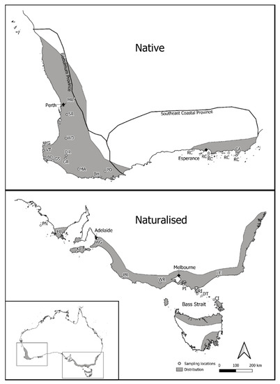 One hundred and ninety-six individuals of P. lophantha representing 14 populations were sampled from the SW WA (native) region of Australia (Figure 1). Native population sampling ranged in size between one and 22 individuals per population, depending on the population size, and included one metapopulation (RC) sampled from vegetative tissue from herbarium specimens of five Recherche Islands off the southwest coast of Western Australia (Table S1). An additional 192 P. lophantha individuals were sampled from the southeastern region of Australia, representing 11 naturalized populations (Figure 1). Naturalized population samples ranged in size from one to 24 individuals per population and included vegetative tissue from herbarium samples collected on five islands off the southeast Australian mainland (Table S1). The growth and reproduction of P. lophantha are important components to consider for sampling. A minimum distance of 2 m was used between samples. The plant age could not be determined, but where there were multiple height cohorts, taken as a proxy for age, each cohort was sampled.