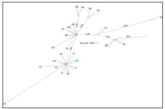 - Evanno, G.; Regnaut, S.; Goudet, J. Detecting the number of clusters of individuals using the software structure: A simulation study. Mol. Ecol. 2005, 14, 2611–2620. [Google Scholar] [CrossRef]