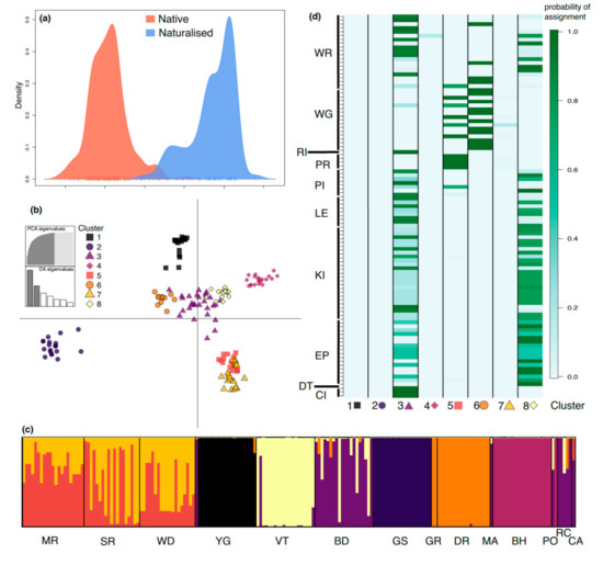 DAPC analysis showed distinct genetic signatures between native and naturalized regions with minimal overlap, which was able to explain 98% of the variation (Figure 3a). When looking at the variation among native populations, we found that they were grouped into eight genetic clusters, with 58.2% of the variation explained by the two DAPC axes (Figure 3b). While admixture occurred within some populations (MR, SR, WD, and BD), low levels of admixture were evident for several other populations, particularly YG, VT, GS, GR, and BH (Figure 3c). The assignment of naturalized individuals to native clusters (Figure 3d) revealed that native populations belonging to clusters 1, 2, 4, and 7 are unlikely to be the origin of naturalized plants found in eastern Australia. However, cluster 3 (populations BD/RC) and cluster 8 (population VT) exhibited a greater genetic similarity to individuals in the naturalized populations. A smaller proportion of naturalized individuals were assigned to the cluster of admixed populations MR, SR, and WD.