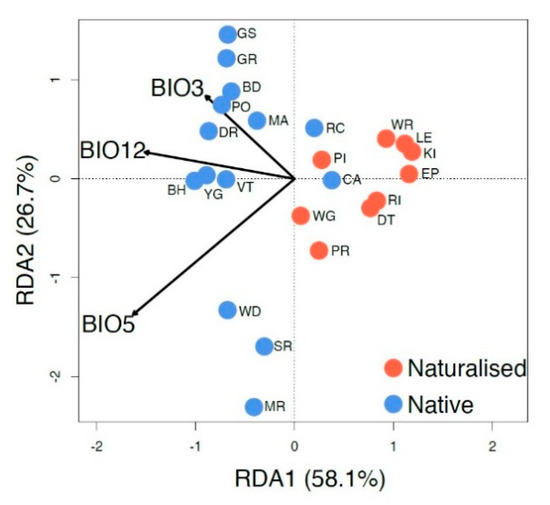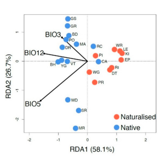 A Redundancy Analysis (RDA) in the R package Vegan [87] was used to identify differences in genetic–climate associations between the populations in native and naturalized regions. We calculated the relationship between precipitation, temperature, and genetic variation using climate data from worldclim: mean annual precipitation (BIO12); maximum temperature of the warmest month (BIO5); and isothermality (BIO3). Pearson’s correlation coefficient (PCC) was used to calculate the similarities between the three environmental variables, in order to ensure their independence and appropriateness for the analysis. PCC ranged from 1 (total positive correlation between the two variables) to −1 (total negative correlation). Population-level allele frequencies were the dependent variable used as the genetic data. To test the relationship between genotype and climate, we used the function rda on the genotypic data, and then fit the climate data to the genotype data using the envfit function employing 999 permutations. The results allowed us to compare how the genetic variation of the native and naturalized regions is differentially related to the climate.