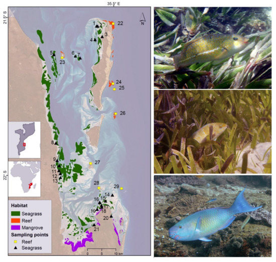 The Bazaruto archipelago showing the study sites and main habitats. Seagrass sites: 1 = Aguya, 2 = Murungulangene, 3 = Sitone, 4 = Matutuile, 5 = Santa Carolina, 6,7 = Canal de Deus 1 and 2, 8 = Vila do Indico, 9 = Mukoque, 10−13 = Vilanculos 1 -4, 14 = Palumba, 15 = Mazarete north, 16 = Mazarete MPA3, 17 = Mazarete MPA 2, 18 = Mazarete MPA 1, 19 = Mazarete, 20 = Chinungwene and 21 = Marape MPA. Reef sites: 22 = Lighthouse, 23 =Santa Carolina, 24 = Six Mile, 25 = Five Mile, 26 = 2 Mile, 27 = Magaruque, 28 = Bangue and 29 = Baluba reef. To the left are the studied species Leptoscarus vaigiensis (terminal phase), Scarus ghobban (initial phase) and Scarus rubroviolaceus (terminal phase). Photo credits C. Berkström and L Eggertsen.