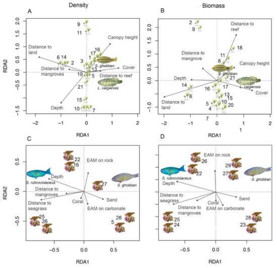 Redundancy ordination plots showing the influence of variables on the density and biomass of three parrotfish species; (A,B) in seagrass meadows (L. vaigiensis and juvenile S. ghobban) and (C,D) on reefs (S. ghobban and S. rubroviolaceus). Length of arrow indicate variable strength. The different survey sites are numbered as in Figure 1. R2 values (A) =0.583, (B) =0.538, (C) =0.877, (D) = 0.895.