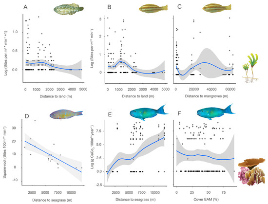 Relationships between significant variables and the number of bites of (A) L. vaigiensis and (B–D) S. ghobban. (E,F) shows bioeroded mass CaCo3 of S. rubroviolaceus in relation to distance to seagrass (p = 0.06) and cover epilithic algal matrix (EAM) (p < 0.05). (A,B,E,F) are modelled with Generalized Additive Models (GAMs) and (D) with linear regression. Upper panels show seagrass habitats and lower panels reefs.