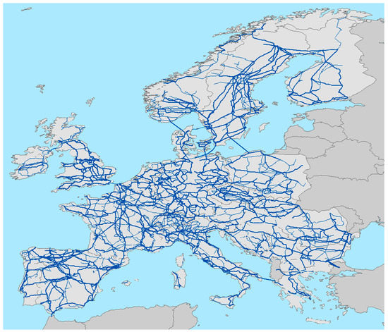 Schematic representation of the transmission line network (220–999 kV) in the European Union. The figure highlights how intensively this area is interconnected through transmission lines.
