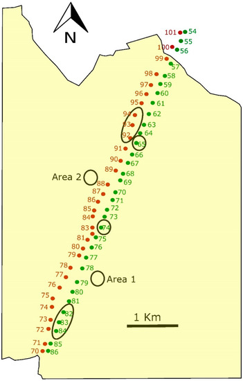 Schematic representation of the study area. Yellow zones are dry crops of cereals and white zone is olive trees with scattered bushes. In green is the location of the towers of the old line and in red are the new ones. Modified tower: old line 82, 83 and 84, new line 92, 93 and 94. Control towers: old line 65 and 74. Control spots outside the line: Area 1 and Area 2.