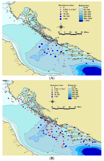 Map of the Adriatic Sea showing the sampling stations of the survey MEDITS done in July 2018 (A) and MEDITS surveys done over the last six summers (2013–2018) (B) The red (negative stations) and blue (positive stations) dots indicate the sampling stations, where blue dot dimensions varied depending on the number of the blue jack mackerel Trachurus picturatus collected.