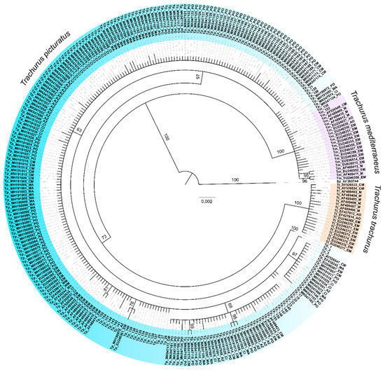 - Bektas, Y.; Belduz, A.O. Molecular phylogeny of Turkish Trachurus species (Perciformes: Carangidae) inferred from mitochondrial DNA analyses. J. Fish Biol. 2008, 73, 1228–1248. [Google Scholar] [CrossRef]