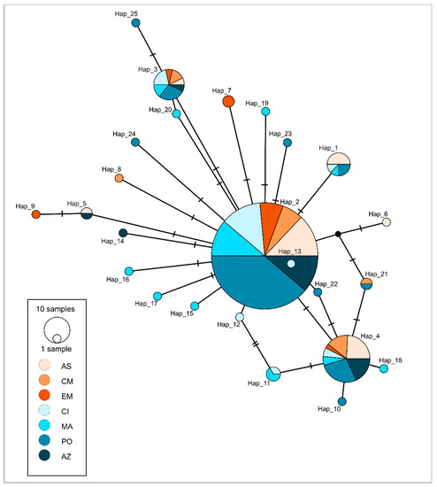 Integer neighbour-joining (IntNJ) network depicting mutational relationships between haplotypes of blue jack mackerel Trachurus picturatus (represented by circles in the lower left corner and coloured according to sampling locality (shades of orange represent Mediterranean Sea: AS—Adriatic Sea, CM—Central Mediterranean and EM—Eastern Mediterranean, while shades of blue represent Atlantic Ocean: CI—Canary Islands, MA—Madeira, PO—Portugal mainland and AZ—Azores). Samples collected from the Adriatic Sea were sequenced within this research, while the rest of the sequences were publicly available from GenBank. The integer edge lengths are chosen using integer linear programming by default, when IntNJ is selected in PopART [30].