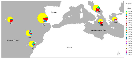 Sampling localities of sequenced blue jack mackerels Trachurus picturatus were placed on a map using PopART and they were named in the same manner as on the IntNJ network (Mediterranean Sea: AS—Adriatic Sea, CM—Central Mediterranean and EM—Eastern Mediterranean; Atlantic Ocean: CI—Canary Islands, MA—Madeira, PO—Portugal mainland and AZ—Azores). Colours indicate different mitochondrial haplotypes (N = 25), and the size of the circles reflects the observed haplotype frequency. Note the presence of the most frequent haplotype Hap_2 on each sampling locality. Samples collected from the Adriatic Sea were sequenced within this research, while the rest of the sequences were publicly available from GenBank. GPS of the localities was approximated according to the description from published research papers/supplementary data or sequence description on GenBank.