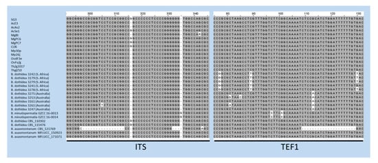 Alignment of ITS and TEF1 sequences of strains of B. dothidea, B. minutispermatia, and B. auasmontanum. Gaps in the sequences of the holotype of the latter species (CBS121769) are evident, along with single nucleotide substitutions in TEF1 sequences of Australian and South African isolates, and the type strains of B. minutispermatia.