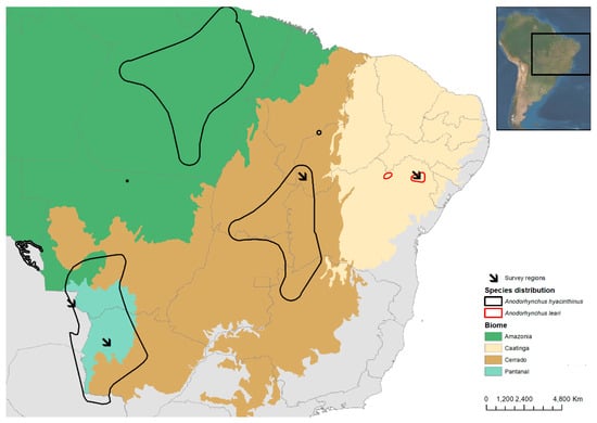 Global distribution of the two macaw species studied in Brazil and Bolivia, biomes, and location of the four study areas (arrows). Maps were generated using ArcGIS v.10.5. (ESRI, Redlands, USA), using biome layers [], Landsat-4 images [], and species distributions available [,].