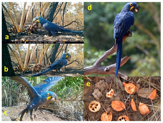 Dispersal process of bush layer palms (Attalea barreirensis and Attalea eichleri), as revealed by camera trapping. Hyacinth macaws landed and walked to the ground-level bunches of fruits (a) to pick up one or two at once and walked to the surroundings (b) to deflesh and ultimately consume the seeds, or they flew (c) to distant perching trees (d) to handle the fruits. Defleshed, predated, and undamaged nuts were easily found under perches (e). Photographs were taken by camera traps (a,b,c), Manuel de la Riva (d), and Fernando Hiraldo (e).