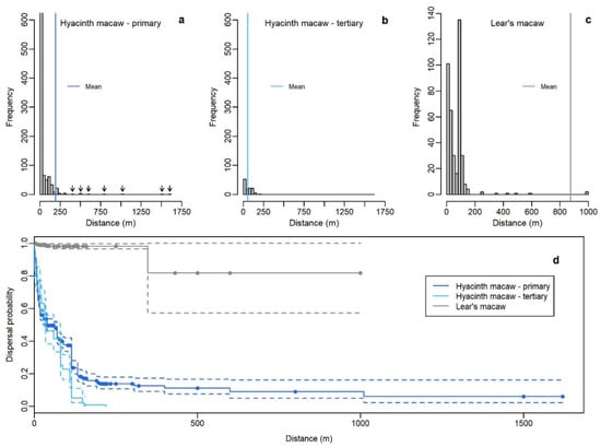 Distribution of fruit dispersal distances recorded for primary (a) and tertiary (b) dispersal in hyacinth and Lear’s macaws (c). Vertical lines show the estimated mean dispersal distances. (d) Kaplan–Meier estimates of dispersal functions; dashed lines show 95% confidence bounds, and solid circles indicate censored (minimum distance) observations.