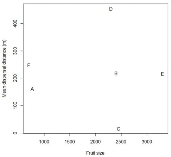 Relationship between estimated mean dispersal distances and fruit sizes (product of length and diameter in mm) in the six studied palm species (A: A. totai, B: A. barreirensis, C: A. eichleri, D: A. phalerata, E: M. flexuosa, F: S. coronata).
