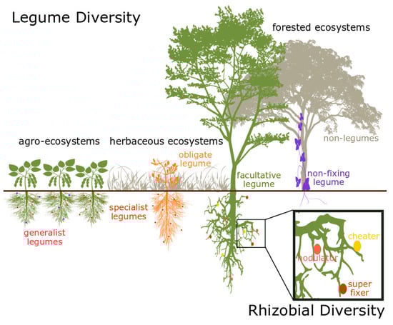 The symbiosis between many legumes (plants in the family Fabaceae) and their nitrogen (N)-fixing microbial partners (bacteria primarily in the order Rhizobiales, among others) allows these organisms to convert atmospheric N2 gas into bio-available forms, making it one of the most important mutualisms affecting the functioning of terrestrial ecosystems. Endosymbiotic rhizobia, housed in specialized root nodules on the legume host, conduct a process known as symbiotic nitrogen fixation (SNF), in which they convert N2 gas into plant-available ammonia, a portion of which they then transfer to the legume host in exchange for photosynthesized carbohydrates [16,17,18]. This highly efficient N-fixing symbiosis can bring >100 kg N ha−1 yr−1 into some ecosystems [19] and represents the largest natural source of N in the terrestrial biosphere [20], in addition to being a critical component of agricultural production worldwide [21]. Because of this critical ecosystem function and their ability to access a different pool of N than most other plants (i.e., niche differentiation), legumes and their symbiotic nitrogen-fixing rhizobial partners have long been a focus of BEF studies [2,22]. While it is important to note that the process of N fixation is carried out exclusively by bacteria, we collectively refer to the legume–rhizobia mutualism as “N fixers” throughout this review for simplicity and to reflect the use of similar terms in the BEF literature. Due to their widespread occurrence, ranging from agricultural systems to herbaceous and forested ecosystems (Figure 1), and their critical role in the BEF relationship, understanding of the role of diversity within N fixers is needed to move the BEF field forward.