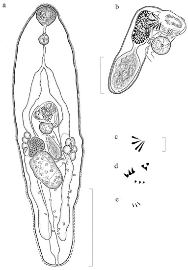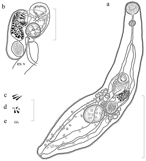 - Yamaguti, S. Synopsis of Digenetic Trematodes of Vertebrates; Keigaku: Tokyo, Japan, 1971. [Google Scholar]