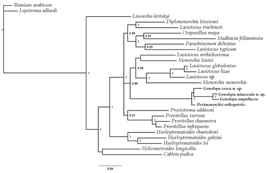 Panyi, A.J.; Curran, S.S.; Overstreet, R.M. Phylogenetic Affinity of Genolopa (Digenea: Monorchiidae) with Descriptions of Two New Species. Diversity 2020, 12, 51. https://doi.org/10.3390/d12020051