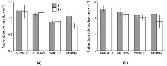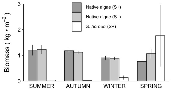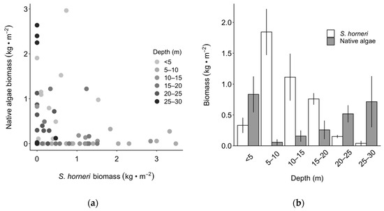 - Sullaway, G.; Edwards, M. Impacts of the non-native alga, Sargassum horneri, on benthic community production in a California Kelp Forest. Mar. Ecol. Prog. Ser. 2020, in press. [Google Scholar] [CrossRef]