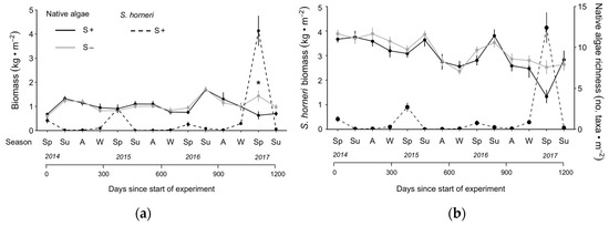 - Marks, L.; Reed, D.; Holbrook, S. SBC LTER: REEF: Data to support "Niche complementarity and resistance to grazing promote the invasion success of Sargassum horneri in North America". Environ. Data Initiat 2020. [Google Scholar] [CrossRef]