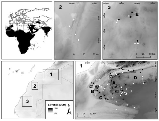 The study area was in the Atlantic Sahara (Morocco), a low-latitude subtropical desert with arid hot climate (after Köppen-Geiger classification, [], where the mean temperature ranges from 22.7 °C in the west (closer to the Atlantic Ocean) to 23.2 °C in the eastern inland areas, and total annual precipitation ranges from 138 to 59 mm, respectively (climate stations at Smara: 26°46′N, 11°31′W, 460 m and Tindouf: 27°40′N, 8°7′W, 401 m). Three areas were surveyed for the present study. The first one was located between the lower Draa River and the upper basin of the Sequiat Al Hamra, (ca km2; altitude ranges 290–770 m a.s.l.; Figure 1). It is a hilly and rocky terrain with intercalated hamadas (elevated plains) and regs (gravels/stony plains). A complex network of ancient dry rivers crosses the entire region, some of them collecting seasonal waters and even the main basins, while the main rivers, the Draa and the Chebeica, hold some permanent water pools, called gueltas. The vegetation is scarce except in the dry rivers basins, where large open savannah-like forests of horn trees (Acacia raddiana) persist, somewhere with Egyptian balsam (Balanites aegyptiaca) and Sodom apple (Calotropis procera) and Rhus tripartita bushes, while tamarisk (Tamarix africana) grows near the gueltas. The endemic tree of Morocco, the argan (Argania spinosa), reaches its southernmost limit here as scattered individuals sheltered in the valleys. The second area comprises the Oued Khat basin (Figure 1), a fossil river valley dominated by reg plains with rocky hills and steps at the borders (ca 1200 km2, 110–220 m a.s.l.). The vegetation is formed by scattered horn trees and camephites as Nucularia perrini. The third area includes the Negjyr Mounts, the Aouserd Mounts and the Oued Jenna (Figure 1), which conform small island-mounts (6–80 km2) and an ancient dry river located in the huge Atlantic Saharan plain (ca 5100 km2, 180–350 m a.s.l.). Climate and vegetation are similar to the Oued Khat area, but the grass Panicum turgidum is more widespread.