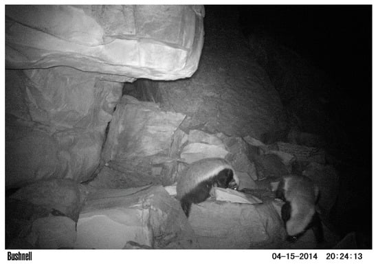 The honey badger feces can be confused with those feces of similarly sized sympatric carnivore species (African golden wolf, red fox, and African wildcat). In the field, scats were preliminarily assigned to the honey badger whenever other signs of presence, such as tracks and hairs, were found. Then, we employed camera trapping at the first found den (Red Aydar, April 2014, Figure 1) for positive species identification []. Two passive infra-red triggered cameras were set relatively close (10 m) and just in front one of the den entrances for 5 days with bee honey as a lure. Two males honey badgers were photographed on 2 different days (Figure 2) and no other carnivore species were detected. This would confirm that the 38 scats (see Table 1) found next to the den probably belonged to honey badgers