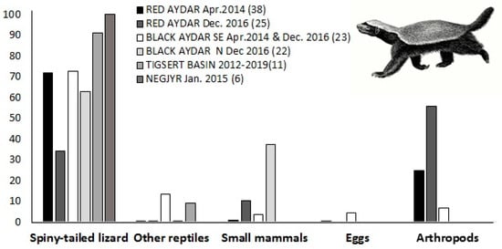 The scats, previously dry-preserved with silica-gel, were broken up and the prey remains were identified to species, where possible, based on macroscopic characteristics of bones, hairs, reptile scales, and invertebrates pieces compared with the reference personal material of collection, bibliography (rodent teeth: []) or were consulted to specialists (Coleoptera Order). The percentage of the volume of each identified prey per scat was estimated visually [,]. The composition of the diet was expressed as a percentage of volume (%V = estimated volume of each prey type/total estimated volume x 100). In order to study regional variations in diet, the samples were separated into 5 areas (Figure 1). Seasonal and/or inter-annual variations could be studied only for one area (Red Aydar, see Figure 1) due to sampling size limitations; the samples obtained in this area during 2 visits were considered separately (see Table 1). Food items were grouped into 5 categories: Spiny-tailed lizard, other reptiles, small mammals, eggs and arthropods. Kruskal-Wallis’s tests were used to detect overall differences in the diet for each one of the 5 categories, whereas Mann-Whitney’s U tests were used to detect differences for each category between pairwise areas/seasons. The sample of Negjyr ( < 10 scats, Table 1) was excluded from U tests.