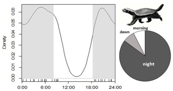 We explored whether the diel activity of the honey badger was shaped by the activity of its staple prey. U. nigriventris is a strictly diurnal species [] that in the study area can be observed out of its burrows from 1 h after sunrise to 1 h before sunset (this study). Honey badger diel activity was estimated by camera trapping. Eleven surveys (Figure 1) with 3 to 24 cameras each (passive infrared triggered) were carried our since 2012 to 2019. Cameras were deployed for periods lasting five days to one year, totalling camera days for 159 effective cameras (some devices were stolen). We used digital passive infrared-triggered devices, baited at 3–6- m with Iberian lynx (Lynx pardinus) urine []. The date and time of each photograph were recorded. The diel activity pattern of honey badgers was assessed following Monterroso et al. [], using Kernel density estimates (see details in []). All captures were separated >1 day, hence, they can be assumed as independent []. Very few pictures of lizards were obtained, insufficient for any activity analysis. We carried out the diel calculation by R [], following the code provided by Ridout and Linkie [].