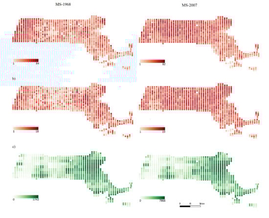 Land-use data were obtained by the US Geological Land-Use Survey [] for 1970s–1980s, and by the 2006 version of the National Land Cover Database (NLCD) [] for the second time period. Both land-use databases were for the United States and measured 30 m resolution. The land-use data layers were combined with Atlas grid cells, and we estimated the area of different land uses per grid cell. Then, we calculated the total area per grid cell of three land-use categories: urban, agricultural, and natural land uses. The grouping of different land uses into the three formulated categories is presented in Table S1. Furthermore, human population density per grid cell was estimated using 1980 and 2005 data from HYDE Gridded Population version 3.1 [,].