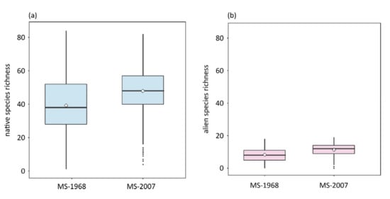Boxplots of (a) native and (b) alien species richness in the first (MS-1968) and the second (MS-2007) time period of breeding birds of Massachusetts per grid cell (grid cell size approximately 25 km2). Diamonds and lines depict mean and median values, respectively.