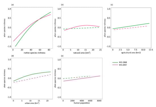 The richness of the MS-1968 alien species increased significantly with native species richness, agricultural area, and urban area, while natural area and human population did not exert a significant effect (Figure 3; Supplementary Material, Table S2). The GAM explained 66.20% of the deviance of alien species richness. By removing the spatial autocorrelation effect, i.e., longitude and latitude as predictors of alien species richness, the explained deviance was approximately 52% (Supplementary Material, Table S3). In the second time period, the significant positive relationship between alien and native species richness remained. Furthermore, MS-2007 alien species richness increased with human population and exhibited a unimodal relationship with area of natural land uses, while the remaining examined predictors did not show a significant effect (Figure 3; Supplementary Material, Table S2). The explained deviance of the GAM was equal to 58.10% after accounting for spatial autocorrelation. Removing the spatial autocorrelation effect, the explained deviance was approximately 56% (Supplementary Material, Table S3).