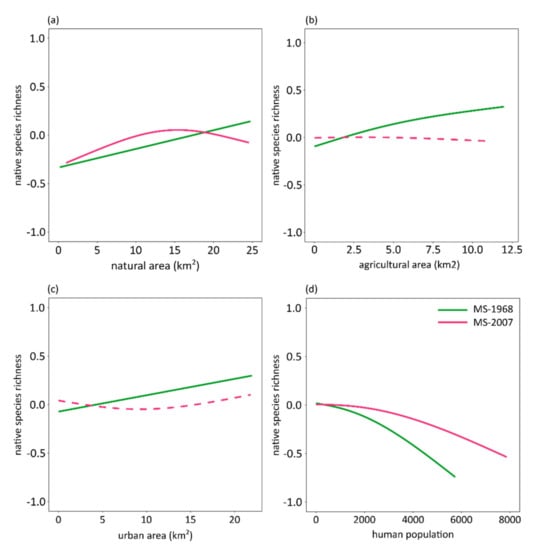Effect plots showing results of Generalized Additive Models using as response variable the native species richness of breeding birds of Massachusetts, and as predictors area of different land uses (natural, agricultural, urban; a–c) and human population (d) for the first (MS-1968, green lines) and the second time period (MS-2007, red lines) after accounting for spatial autocorrelation. All predictors entered model as smooth functions; thus, y-axis presents mean-centered native species richness summing up to zero. Significant relationships depicted with solid lines; dashed lines denote non-significant relationships.