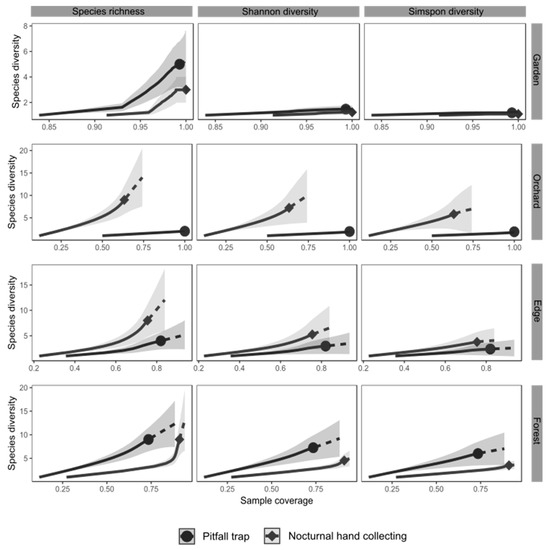 Estimated taxonomic diversity (species richness, Shannon, and Simpson diversities) in all four habitats for each sampling method. 95% confidence intervals are represented in a light color and were obtained by 200 bootstrap replications. Plain lines represent interpolated diversity, whereas dotted lines extrapolated.