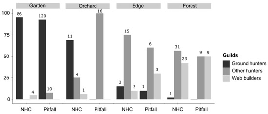 Guild composition significantly changed among habitats for both methods when considering pitfall traps and NHC separately (χ² tests, 6df, χ² = 403.97, and χ² = 274.29, p < 0.001, respectively) with a replacement of ground hunters by other hunters and web builders. On the other hand, patterns of guild relative abundance differed between methods only for the orchard and forests (Figure 2).