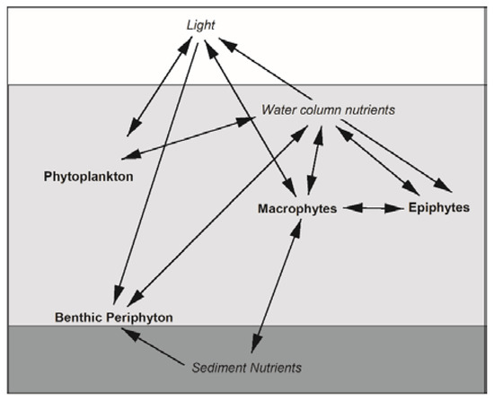 Interactions among littoral primary producers (bold) and their resources (italics) in lakes. Arrows represent the directions of interactions but do not differentiate between positive or negative effects.