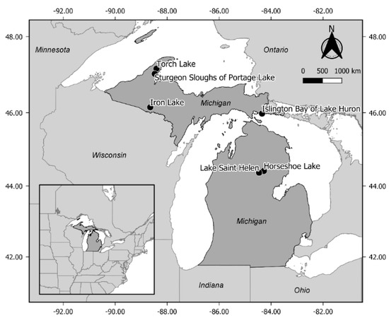 This field study was conducted July–September 2017 in littoral zones of 6 lakes in the Upper Peninsula and northern Lower Peninsula of Michigan (Figure 2). Waterbodies with IWM were selected based on personal observation and Michigan Invasive Species Investigation Network (MISIN) database records [34]. Additionally, waterbodies with management programs for macrophytes and IWM using herbicides were avoided unless treatments were limited in scope, and at a distance we judged would not affect our study. This was determined by checking the Michigan Department of Environment, Great Lakes and Energy’s MiWaters database [35] and personal communication with aquatic managers. In the largest waterbodies (Lake St. Helen, Sturgeon Sloughs of Portage Lake, and Islington Bay of Lake Huron) some treatments occurred, but treatment locations were not hydrologically connected to our study areas (e.g., between embayments with limited water exchange, in adjacent slough areas > 1.5 km from the selected study plots). Selected waterbodies were oligotrophic to mesotrophic and ranged in size from small inland lakes to connected waterways of the Laurentian Great Lakes (Table 1). Torch Lake was the largest and deepest lake sampled (area = 11.0 km2, mean depth 15 m), and is connected to the Keweenaw Waterway, which bisects the Keweenaw Peninsula of the Upper Peninsula and is connected to Lake Superior. Sturgeon Sloughs of Portage Lake is a complex of littoral habitat adjacent to the Sturgeon River delta also on the Keweenaw Waterway. An open bay in the Sturgeon Sloughs of Portage Lake (area of bay = 1.0 km2, mean depth 2 m) was used as a study area. Iron Lake (area = 1.6 km2, mean depth 6 m) is an inland lake in southwest Upper Peninsula and 1/10th the size of Torch Lake. Islington Bay of Lake Huron is an oligotrophic, shallow enclosed bay (area = 1.6 km2, mean depth 2 m) in the Les Cheneaux Islands region of northern Lake Huron. Horseshoe Lake is oligotrophic and the smallest inland lake included in this study (area = 0.15 km2, mean depth 3 m), located in central Lower Peninsula. Lake St. Helen is a large inland lake (area = 9.7 km2, mean depth 2 m) in central Lower Peninsula with a high percentage of littoral habitat.