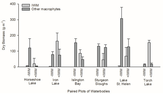 Standing crops of macrophytes in paired +IWM and −IWM plots, scaled per m2 of plot surface area. “Other macrophytes” represents the sum of mean standing crops of all native macrophyte species in each plot. An error bar represents the standard error of 20 samples collected in each plot.