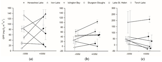 Gross primary production (GPP) measured in light-dark bottles, and scaled per plot area of (a) epiphyte, (b) phytoplankton, and (c) benthic periphyton. Means ± 1 standard error are represented by symbols with error bars. Shaded symbols represent +IWM plots, and unshaded symbols represent −IWM plots for each waterbody. Lines connecting symbols illustrate differences in paired plots. Symbols are offset horizontally to aid in interpretation of error bars.