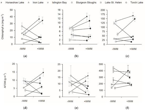 Standing crops of chlorophyll a and ash free dry mass (AFDM) for (a,d) epiphyte, (b,e) phytoplankton, and (c,f) benthic periphyton. Means ± 1 SE are represented by symbols with error bars. Shaded symbols represent +IWM plots and unshaded symbols represent −IWM plots for each waterbody. Lines connecting symbols illustrate differences in paired plots. Symbols are offset horizontally to aid in interpretation of error bars.