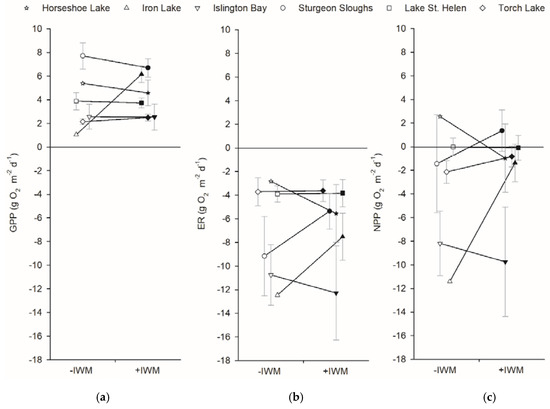 Mean (a) GPP, (b) ER, and (c) net primary production (NPP) rates measured using the open-water technique and averaged over deployment periods. Means ± 1 SE are represented by symbols with error bars. Shaded symbols represent +IWM plots and unshaded symbols represent −IWM plots for each waterbody. Lines connecting symbols illustrate differences in paired plots. Symbols are offset horizontally to aid in interpretation of error bars.