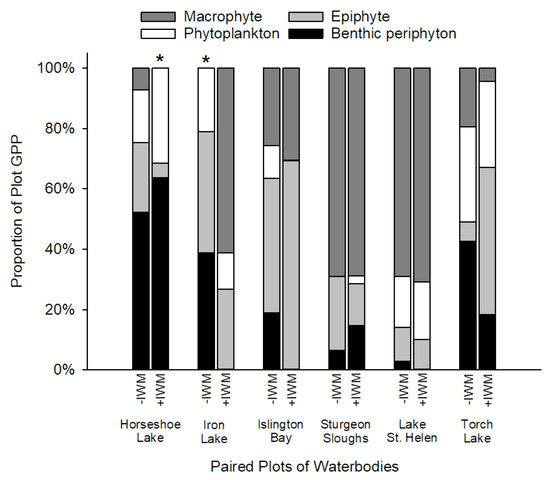 Proportions of plot GPP by epiphyte, phytoplankton, benthic periphyton, and estimated macrophytes in paired +IWM and −IWM plots. Proportions of GPP from macrophytes that were set to zero are indicated with (*); see related methods in Section 2.7.