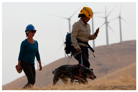 - Smallwood, K.S.; Bell, D.A.; Standish, S. Dogs detect larger wind energy impacts on bats and birds. J. Wildl. Manage 2020. In press. [Google Scholar]