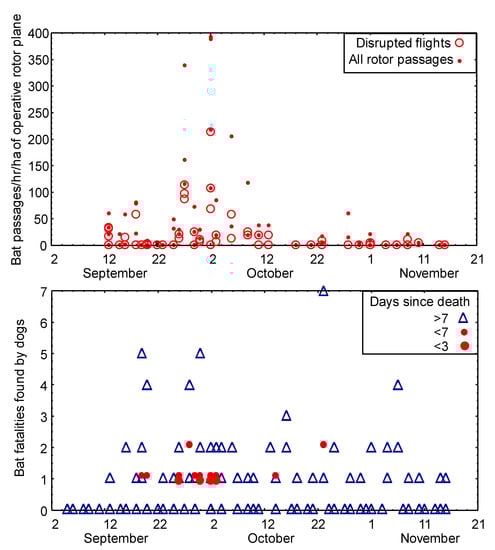 - Roemer, C.; Disca, T.; Coulon, A.; Bas, Y. Bat flight height monitored from wind masts predicts mortality risk at wind farms. Biol. Conserv. 2017, 215, 116–122. [Google Scholar] [CrossRef]