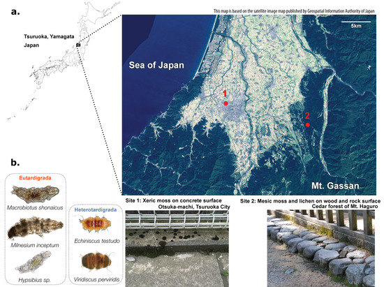 Details of the sampling location. (a) Map of sampling location (above) and photos of the sampling site (below). Site 1 is within Tsuruoka city, and site 2 is in the cedar forest of Mt. Haguro. This map is based on the satellite image map published by the Geospatial Information Authority of Japan. (b) Microscope images of five tardigrades morphologically identified in site 1: xeric moss.