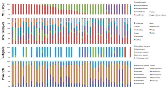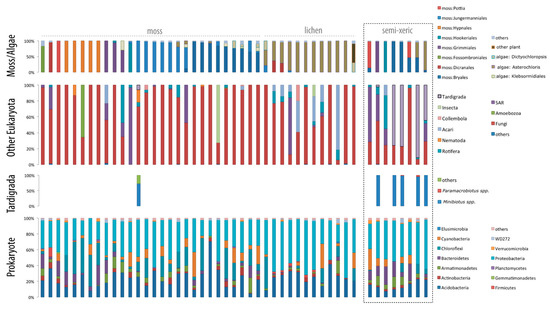 Amplicon abundance ratios in xeric mosses. Relative abundances of amplicon reads within OTUs assigned to moss/lichen, other Eukaryota, tardigrades, and bacteria are shown separately. The moss samples were mostly from Bryum argenteum (Bryales), and as the sampled location was the type locality of Macrobiotus shonaicus, we see several moss contained 18S amplicons from this species. The majority of bacteria consisted of Cyanobacteria, Proteobacteria, and Bacteroidetes.