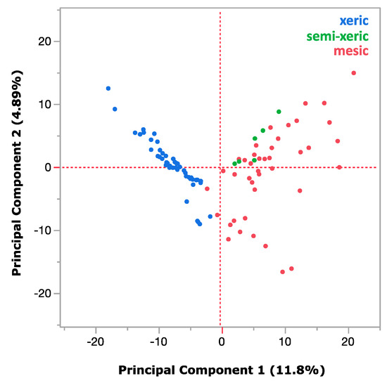 Principal component analysis of all of the moss samples analyzed in this work (blue: xeric mosses; green: semi-xeric mosses; red: mesic moss and lichens). Xeric and mesic mosses show distinct clusters, and semi-xeric mosses tend to shift from the mesic mosses and lichens towards the xeric mosses.