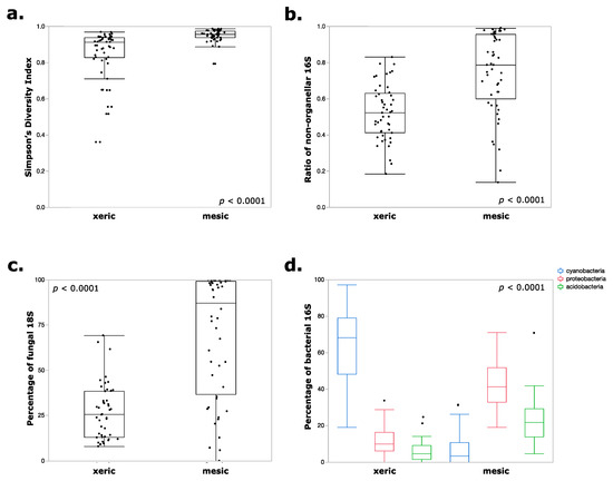 Comparisons between xeric and mesic and semi-xeric samples. (a) Simpson’s diversity index distribution calculated for bacterial amplicon abundances. The xeric samples were much less diverse than the mesic samples. (b) The xeric samples contained a large amount of organellar 16S rDNA (both from chloroplasts and mitochondria), with as much as 50% on average, even with the presence of inhibitory PNAs. Together with the lower Simpson’s diversity, these results suggest a limited bacterial population within xeric mosses. (c) Fungi was highly abundant in mesic samples, whereas (d) Cyanobacteria was much more abundant in xeric mosses, and the mesic samples contained more Proteobacteria and Acidobacteria. All of the comparisons between xeric and mesic samples were significant (p < 0.0001) in two-tailed Student’s t-tests.