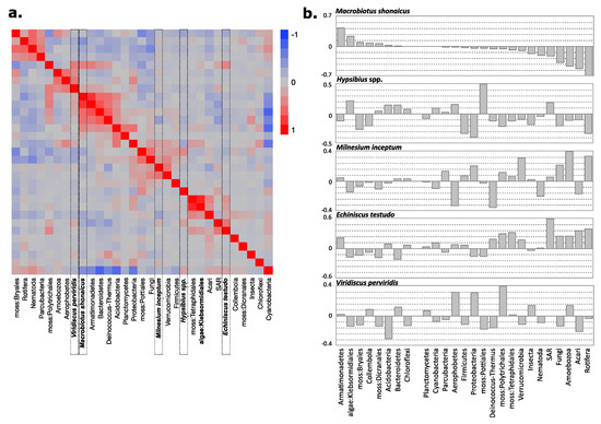 Correlations between species abundances within mesic samples. (a) Pearson correlation clustering of species abundances. Macrobiotus shonaicus is clustered with Armatimonadetes, Bacteroidetes, Deinococcus–Thermus, and Acidobacteria but is negatively correlated with Cyanobacteria and Rotifera. (b) Normalized coefficients for the partial least squares (PLS) model. Similar to the Pearson correlation, Armatimonadetes has the highest positive coefficient for M. shonaicus, and Rotifera has the highest negative coefficient.