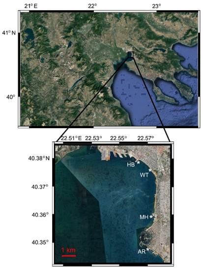 Study area in Thermaikos Bay, indicating the location of the four sampling sites (*). WT: White Tower; AR: Aretsou; MH: Music Hall; HB: Harbour. Modified from [33].