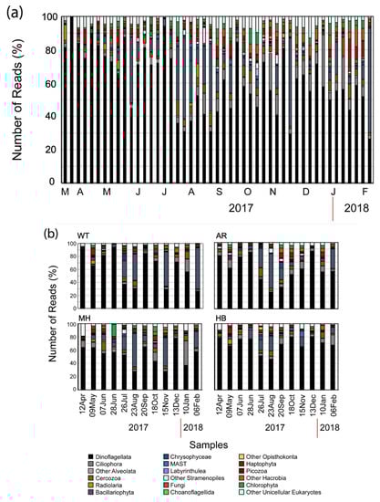 - Hu, S.K.; Campbell, V.; Connell, P.; Gellene, A.G.; Liu, Z.; Terrado, R.; Caron, D.A. Protistan diversity and activity inferred from RNA and DNA at a coastal ocean site in the eastern North Pacific. FEMS Microbiol. Ecol. 2016, 92, fiw050. [Google Scholar] [CrossRef]